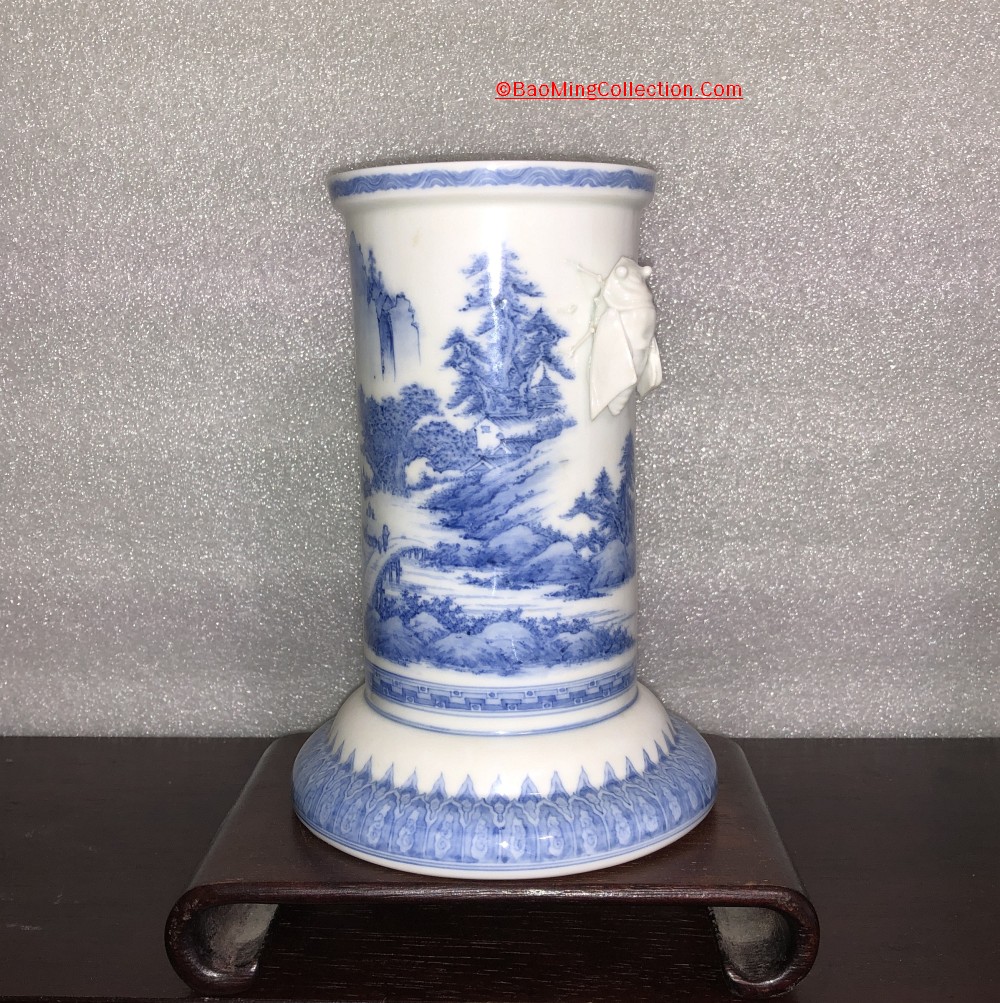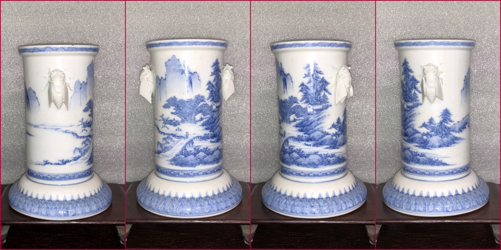Personal Collection. Item is not for sale. Japanese Hirado ware blue and white porcelain vase with cicada handles and landscape decoration.