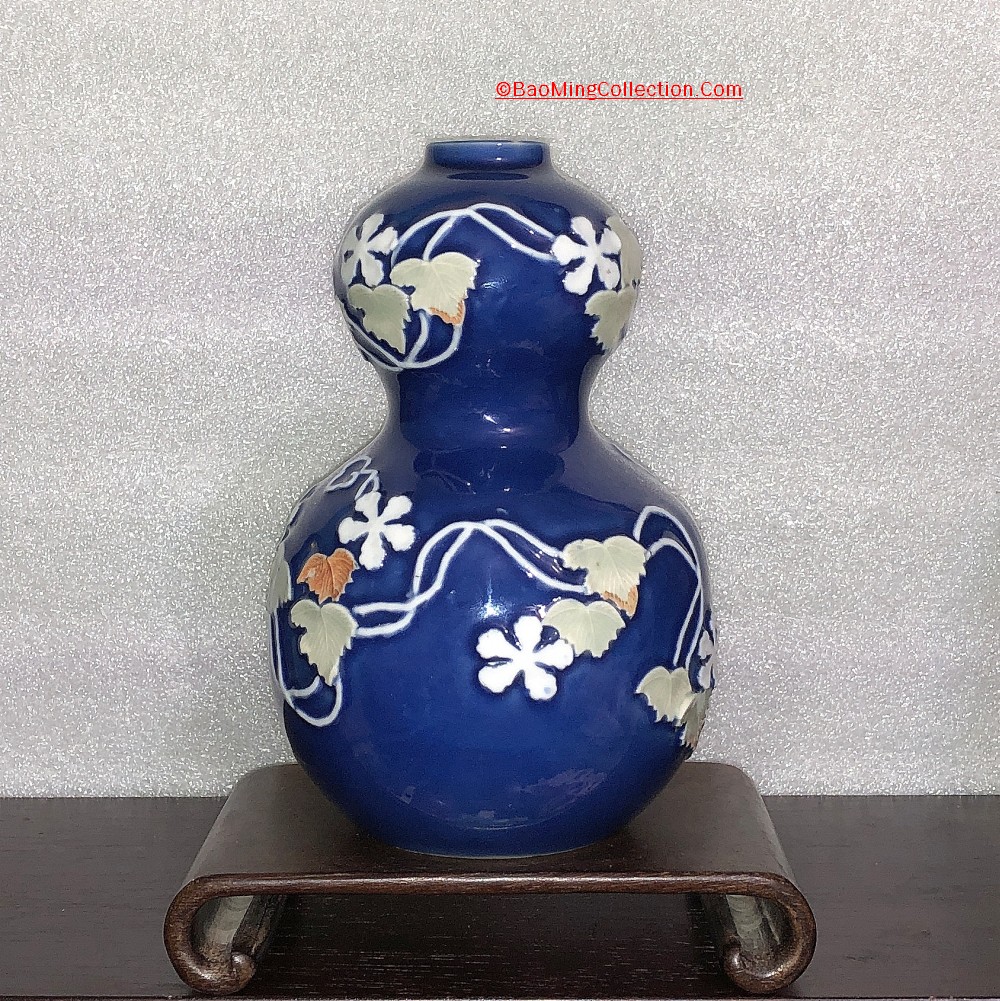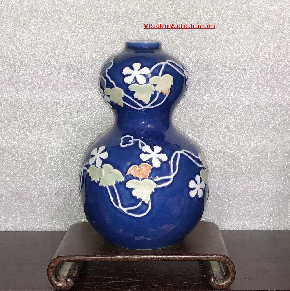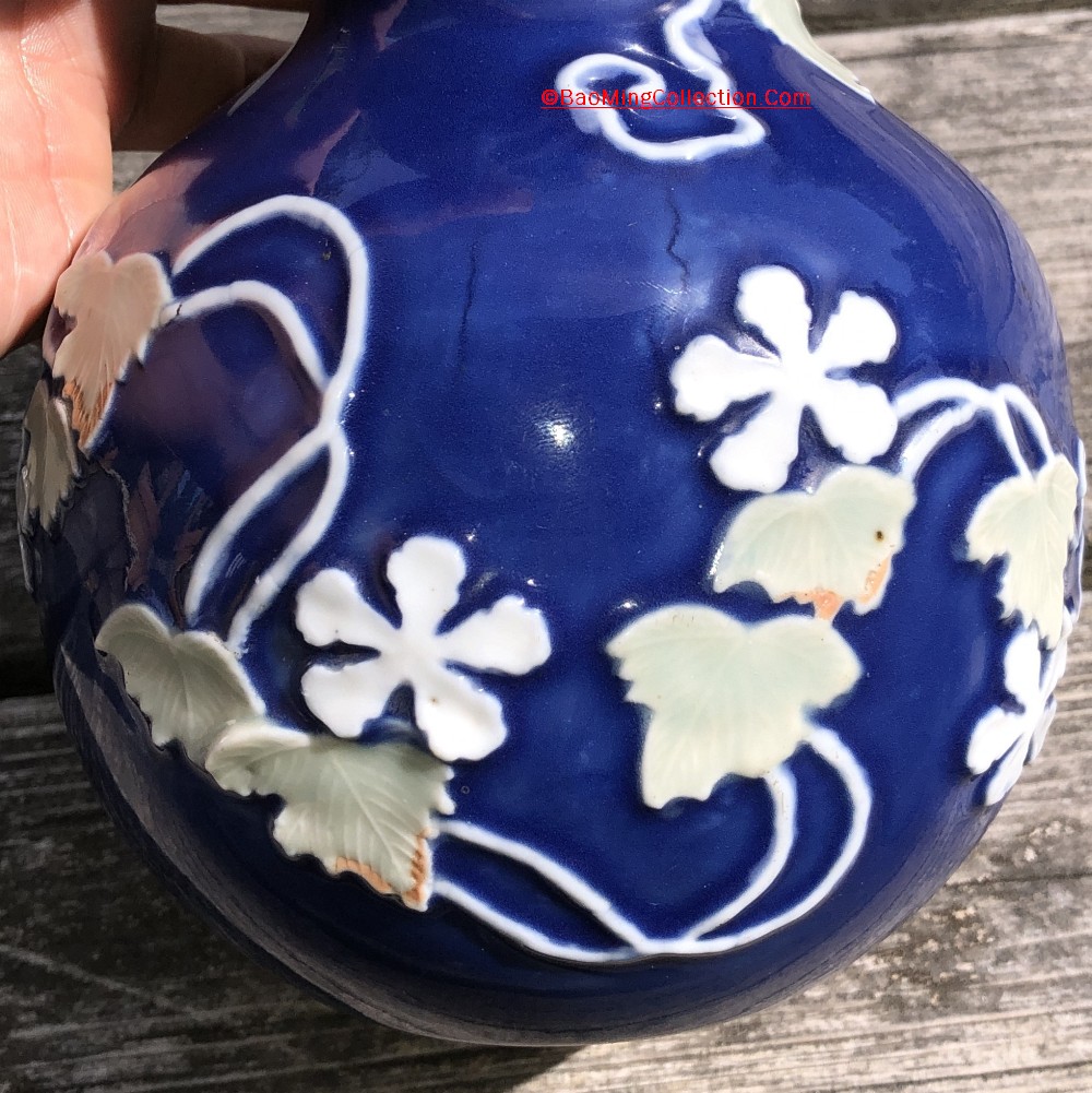 Personal Collection. Item is not for sale. A rare Japanese Hirado ware with blue glazed ground and mold decoration of five star jasmine flower and vines.