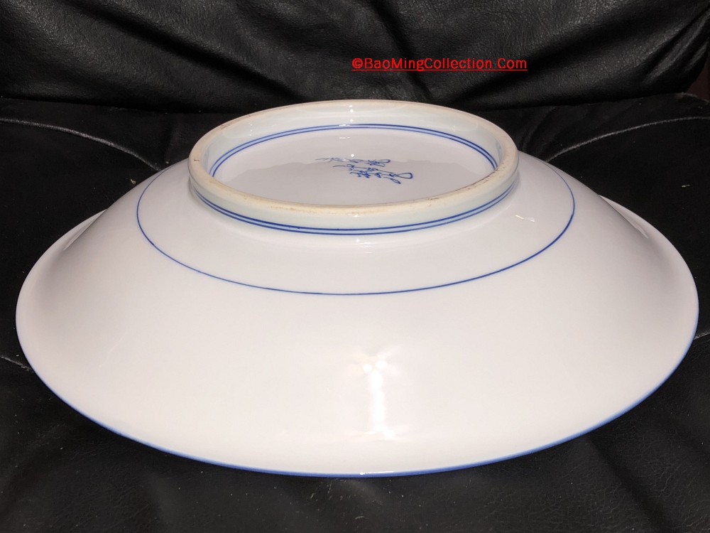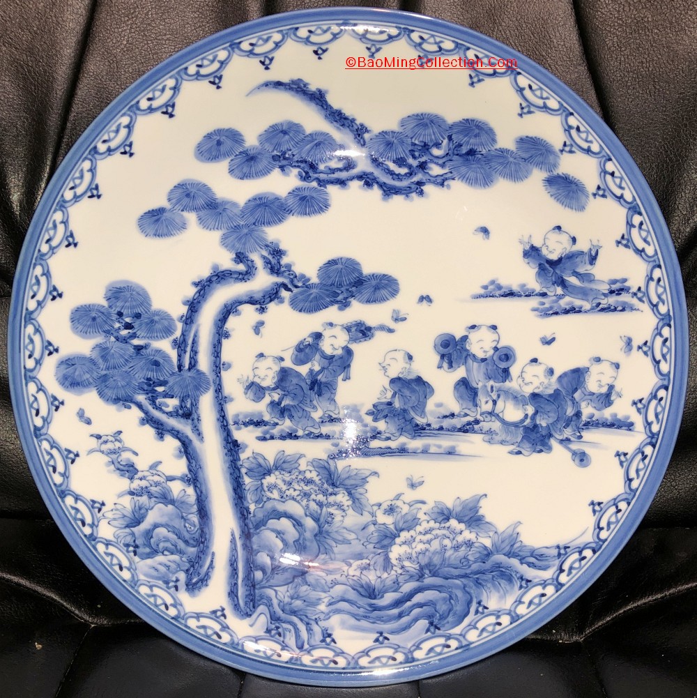 Personal Collection. Item is not for sale. Japanese Hirado ware blue and white porcelain charger decorated with "Seven Boys" frolicking around an old pine tree surrounded by peony and other flowers.