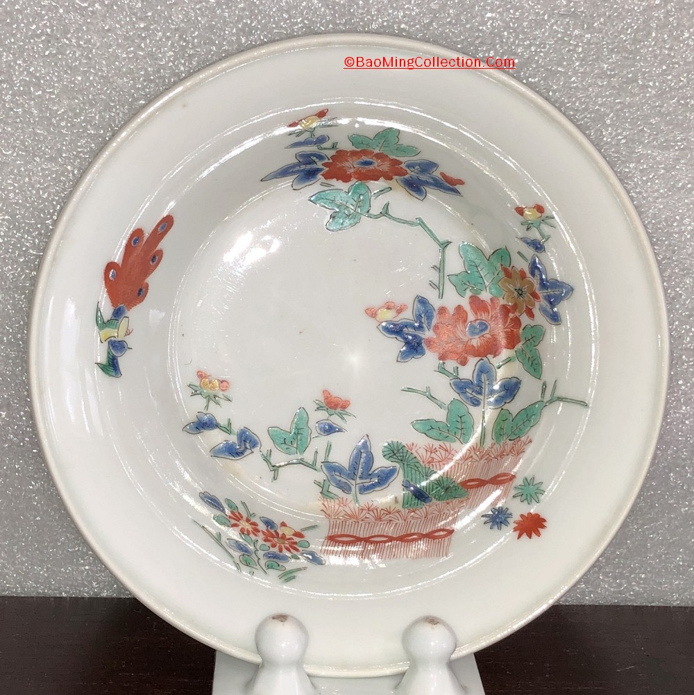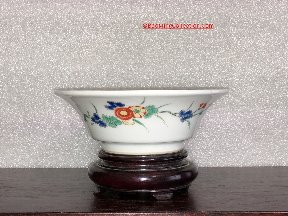 Set of 5 Japanese Kakiemon porcelain bowls with original antique wooden storage box. The bowls have flat bottom; they're used for eating sweet and snacks.